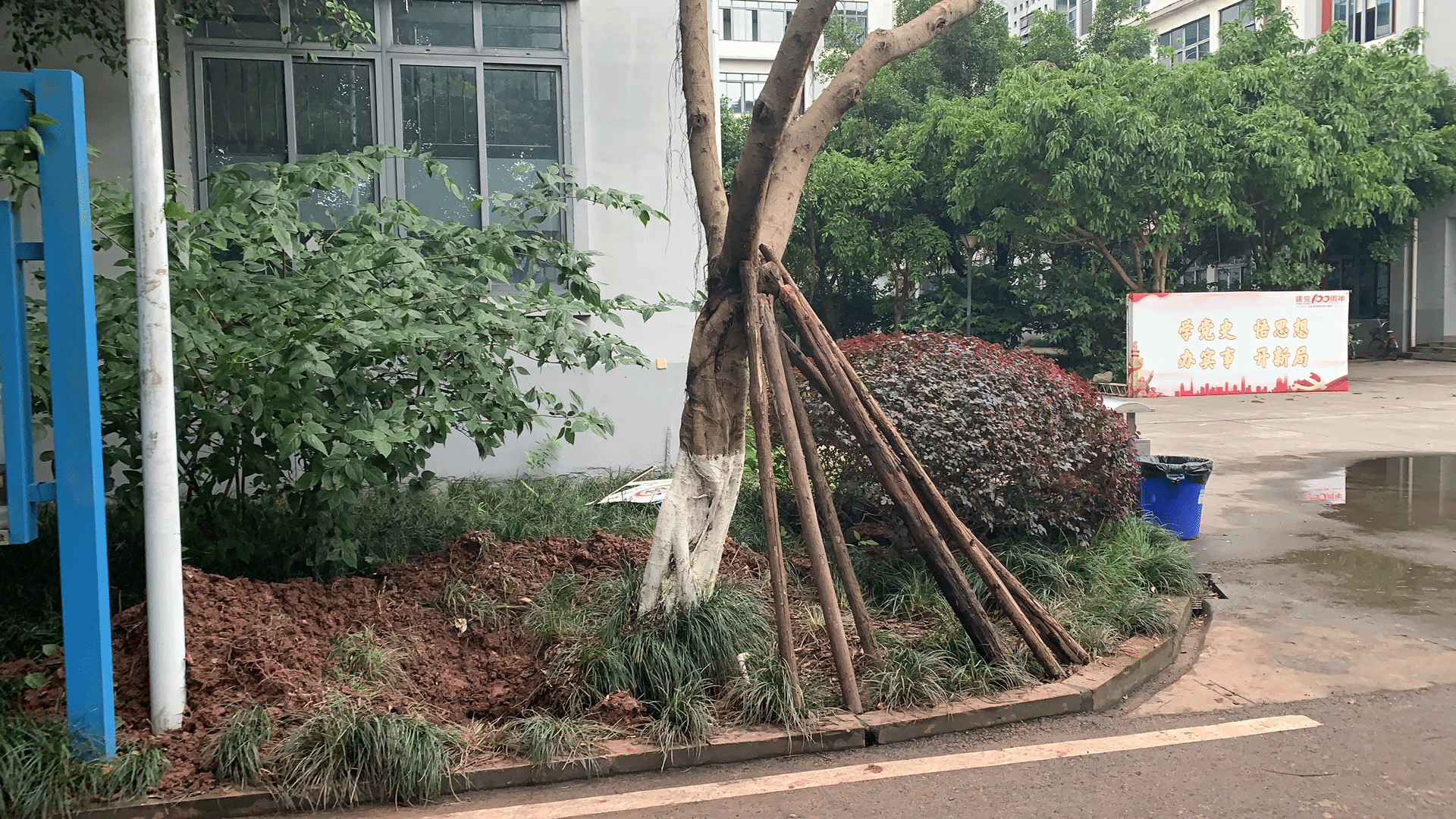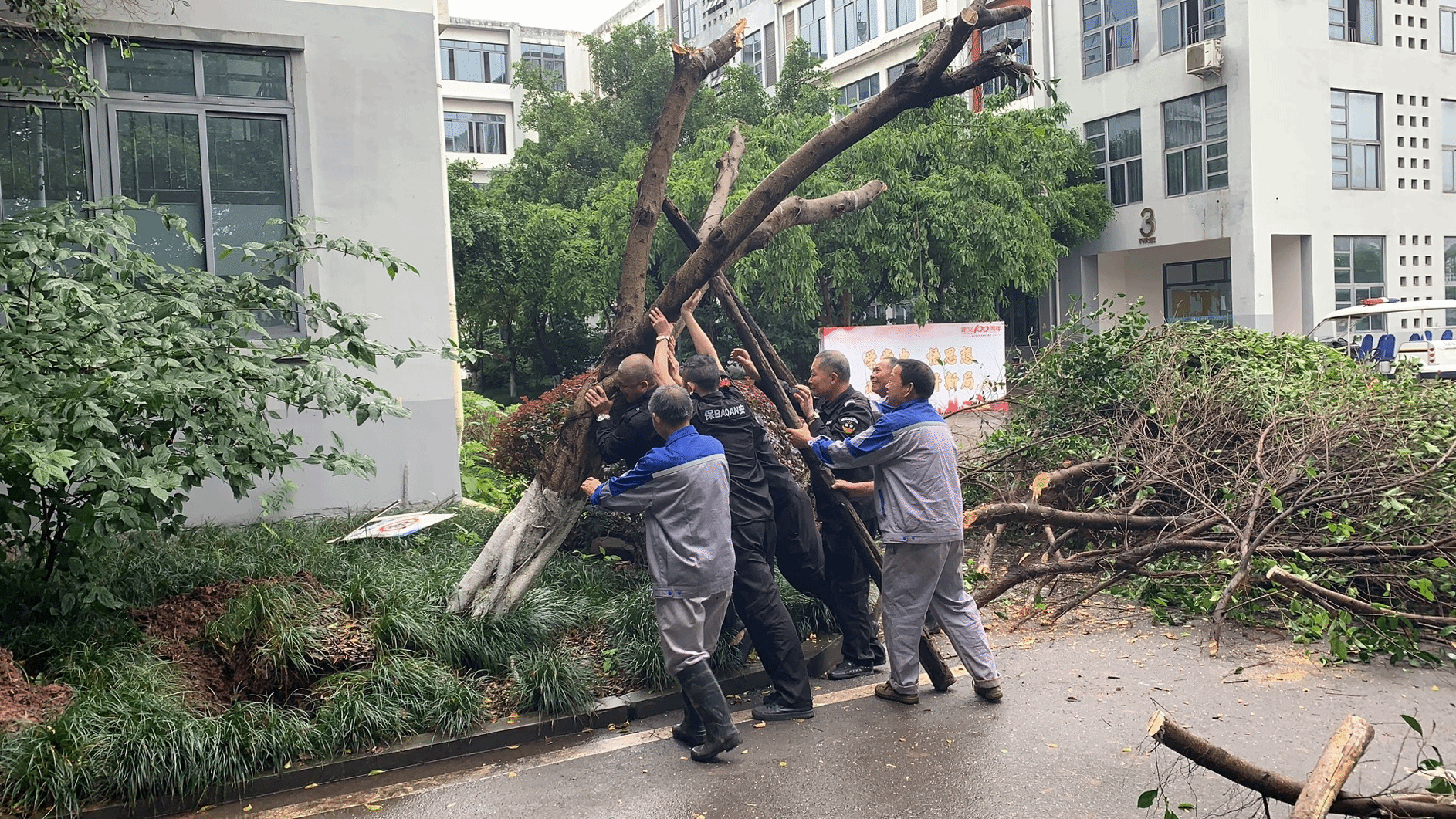 5月6日凌晨,由于突降暴雨,且夜晚降水持续时间长、雨量大,同时伴有强风,受此恶劣天气影响第2教学楼旁一颗大树倒伏,极大地影响了道路通行,同时也带来一定的安全隐患。