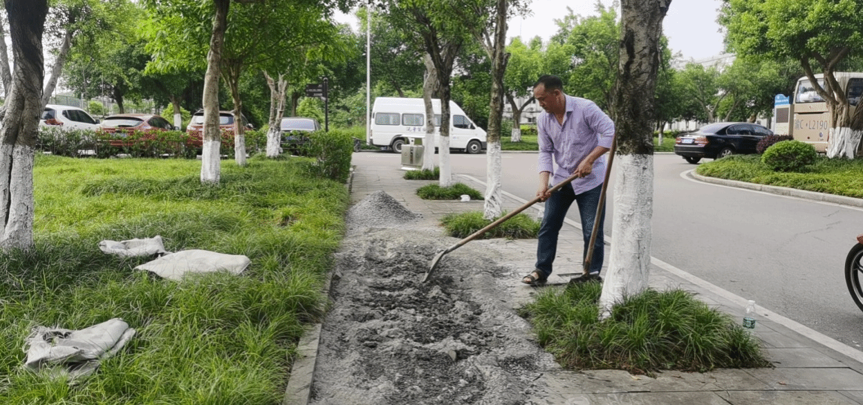 针对这一情况,2138CC太阳集团负责人立即安排维修工开展路面破损调查和制定修补方案,并联系采购水泥沙石。维修人员在炎热的天气下用碎石、沙子和水泥填补沉降坑位,并对松动的水泥地漏四周进行填补和加固。同时在施工过程中采取先和水的措施来减少扬尘和确保水泥沙石的有效结合。在施工现场,后勤工作人员设置了标识、标志,提醒广大师生经过时注意避让,天气炎热,后勤维修人员虽汗流浃背但却工作热情高涨,丝毫没有影响施工进度。